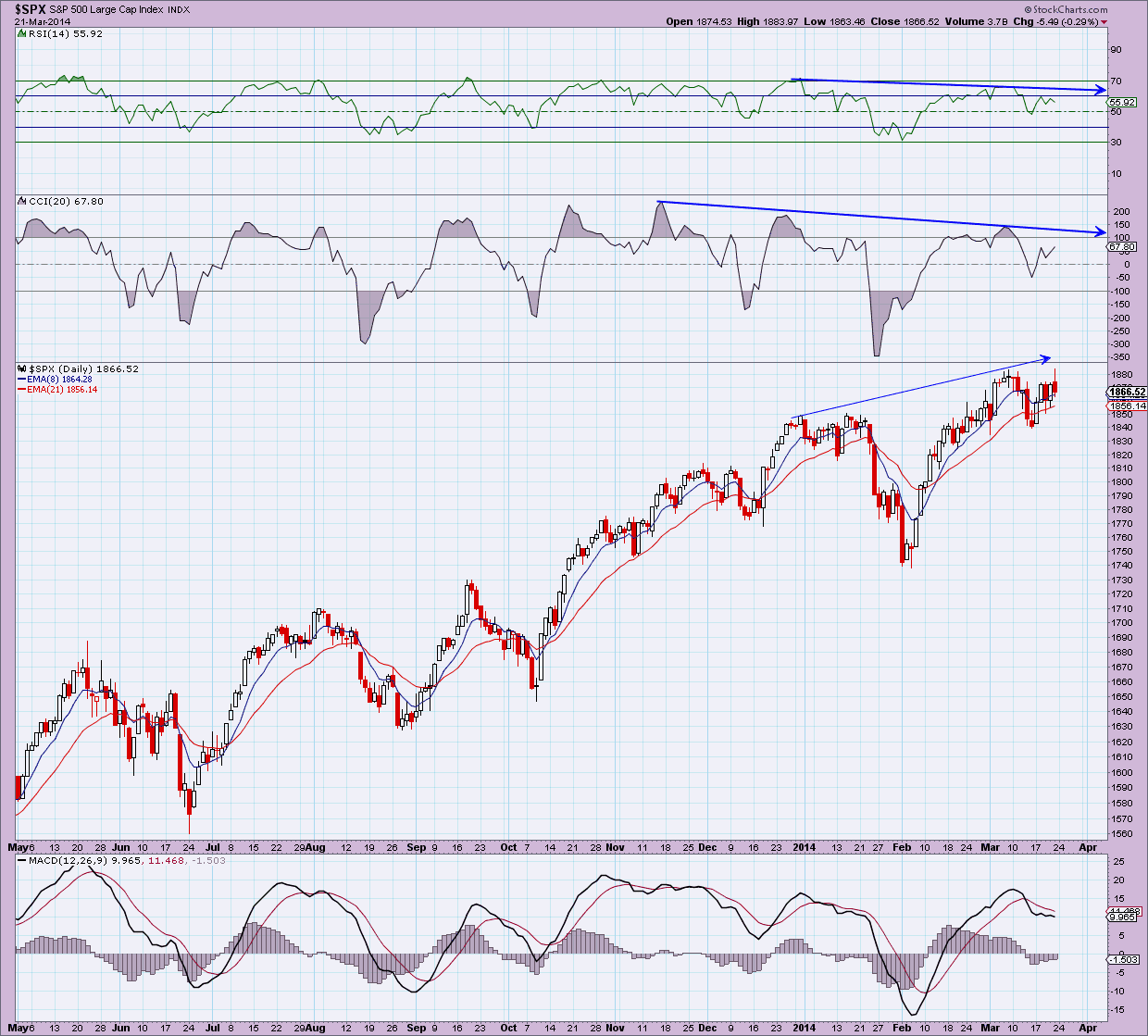 The weekly and the daily charts of the S&P 500 I'm posting below are indicative of the loss in momentum in equities over the past month: